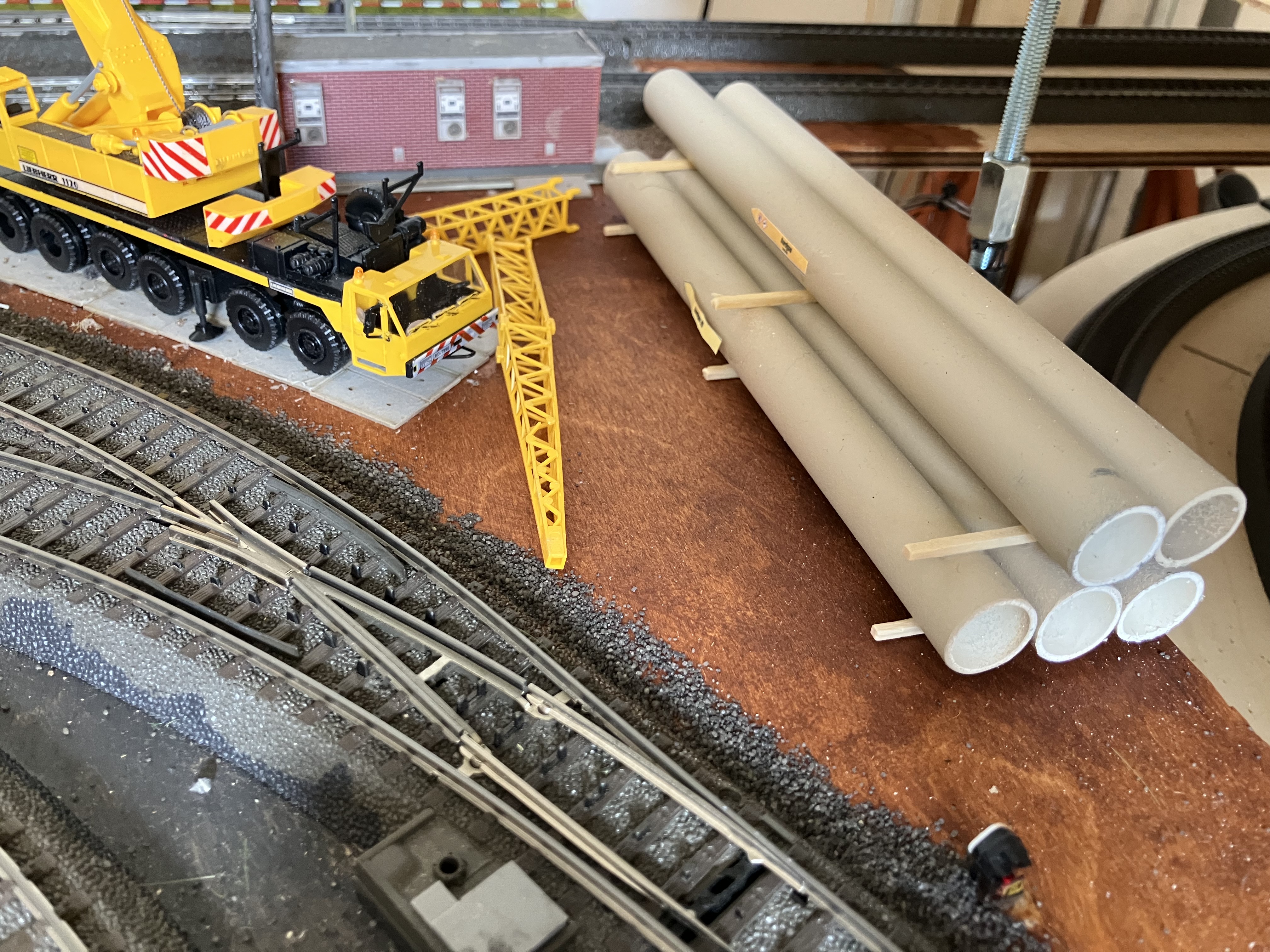Voor de aardgaspijpleiding is elektriciteitsbuis gebruikt die gewoon verkrijgbaar is bij de bouwmarkt. De buis heb ik met een spuitbus in de kleur lichtgrijs gespoten. Voor de verbindingen heb ik verbindingsstukken, die breder zijn, in smalle ringen gezaagd. Het grote voorbeeld is de pijpleiding in een diorama wat ik gezien op OnTrax in het Spoorwegmuseum. Op deze foto is ook te zien dat ik ballast en verdere scenery heb aangebracht op dit deel van de baan. Hiervoor heb ik de speciaal voor C-rails gemaakte ballast gebruikt. Leerpuntje is dat je moet oppassen geen ballast, die heel fijn van structuur is, op de wissels te strooien. Heeft bij mij tot een wisselstoring geleid met als gevolg een hoop werk om de wissel weer functionerend te krijgen.