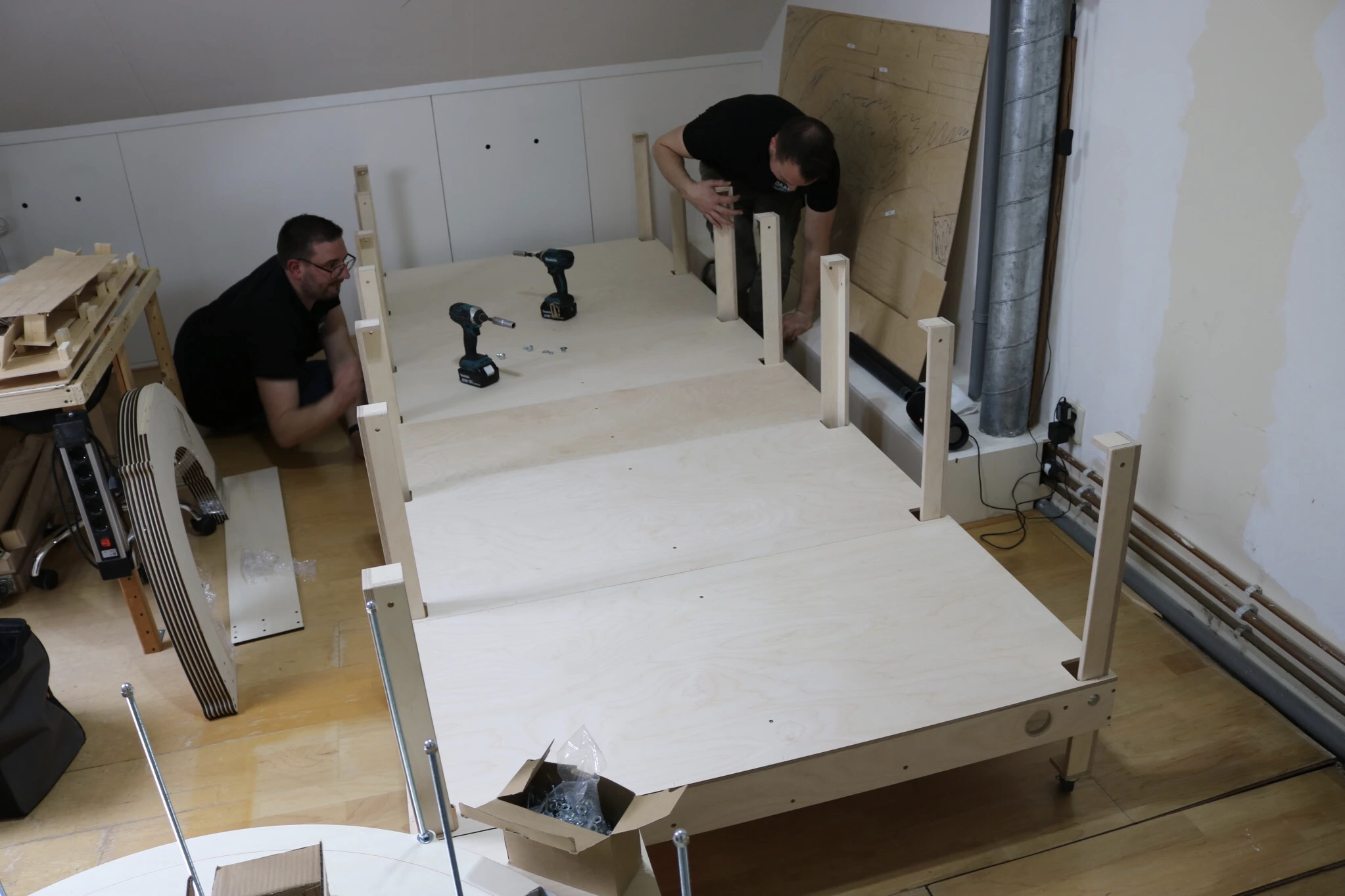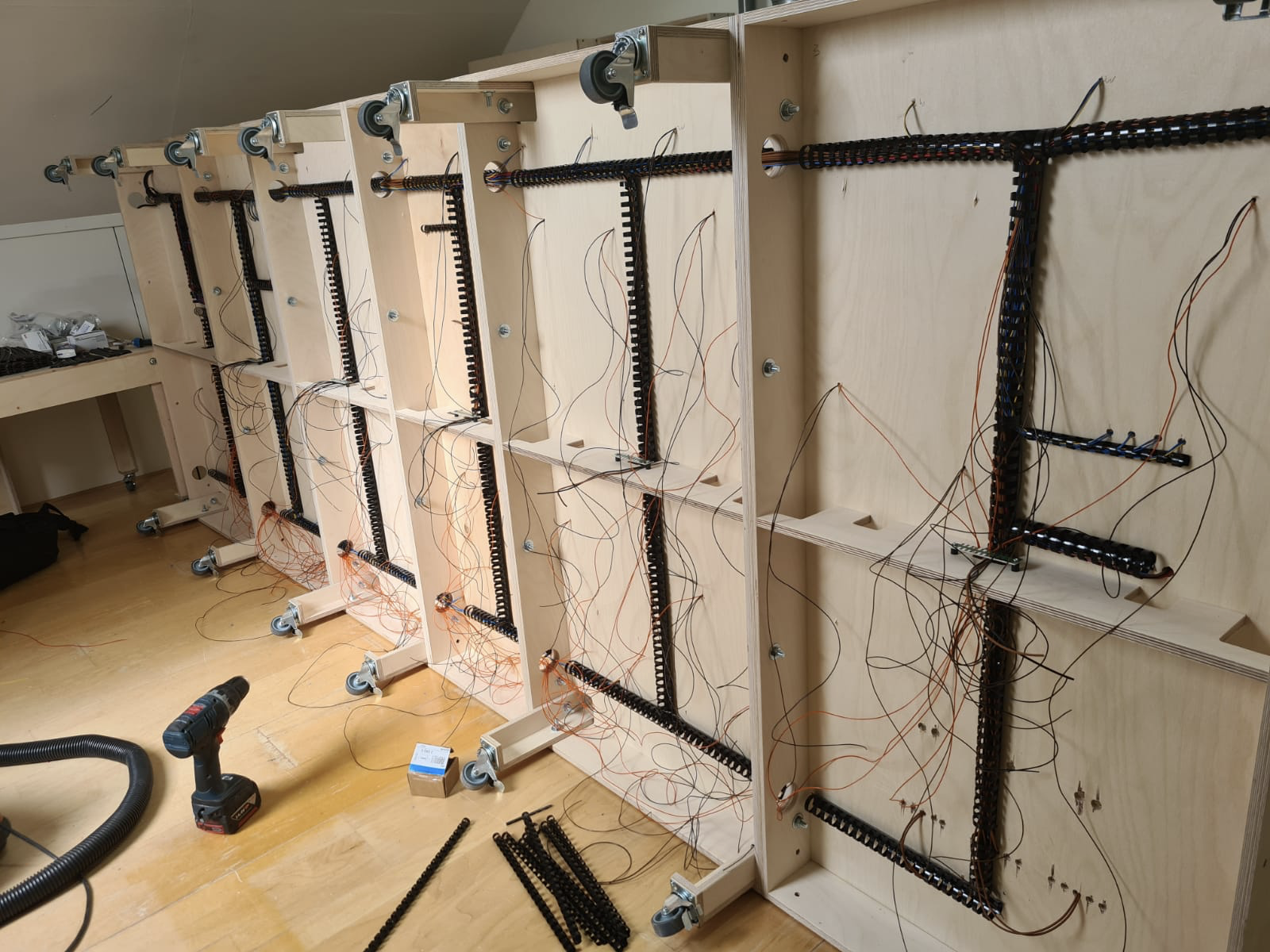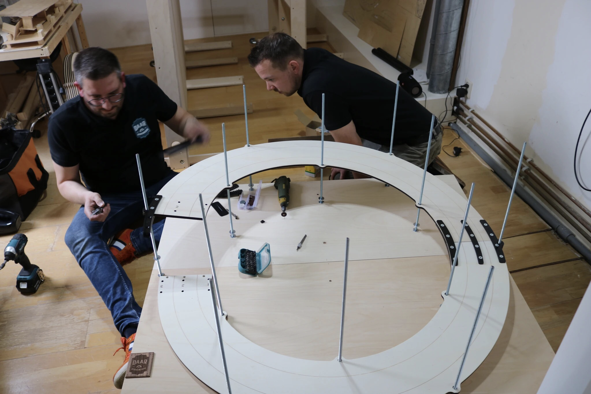 Voor de treintafel op zolder heb ik de hulp ingeroepen van de mannen van DAAR (www.daarkunjemeebouwen.nl) uit Drunen. DAniël en ARno leveren lasercut modules (zie de foto’s verderop) met standaardafmetingen en ook maatwerk. Ik heb zowel de onderbouw (heet dus geen treintafel meer) voor het schaduwstation als de zichtbaan als de klimspiraal door hen laten maken. Daarbij heb ik gekozen om de poten op (geremde) wielen te laten zetten, waardoor de toegankelijk- en bereikbaarheid vergroot wordt.