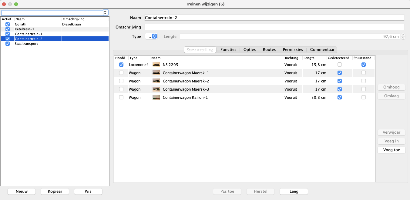 Met de gegevens van de loks en de wagons kan je je treinen samenstellen. De lengte wordt dan automatisch berekend door iTrain.