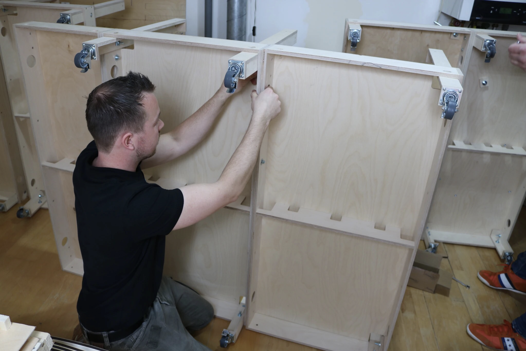 Is naar mijn idee en ervaring het meest cruciaal in latere (on)tevredenheid over het functioneren van je baan. De poten van mijn eerste baan had ik gemaakt van een Ikea stellingkast. Door wat te meten en te zagen krijg je 4 dubbele poten waar je dan ook nog wat tussen kon leggen. Ik vergat de poten te stabiliseren waardoor de tafel van links naar rechts zwiepte. Dat heb ik opgelost door twee poten te verankeren aan de muur. Elke keer als ik achter de tafel wilde, moest ik onder de tafel de poten losschroeven en weer vastschroeven. De poten stonden ook te ver uit elkaar waardoor in het midden een soort kuil was ontstaan waar alle wagons naartoe kropen. Omdat ik dus geen goede timmerman ben, komt er een ‘make or buy’ moment. En het werd dus ‘buy’.