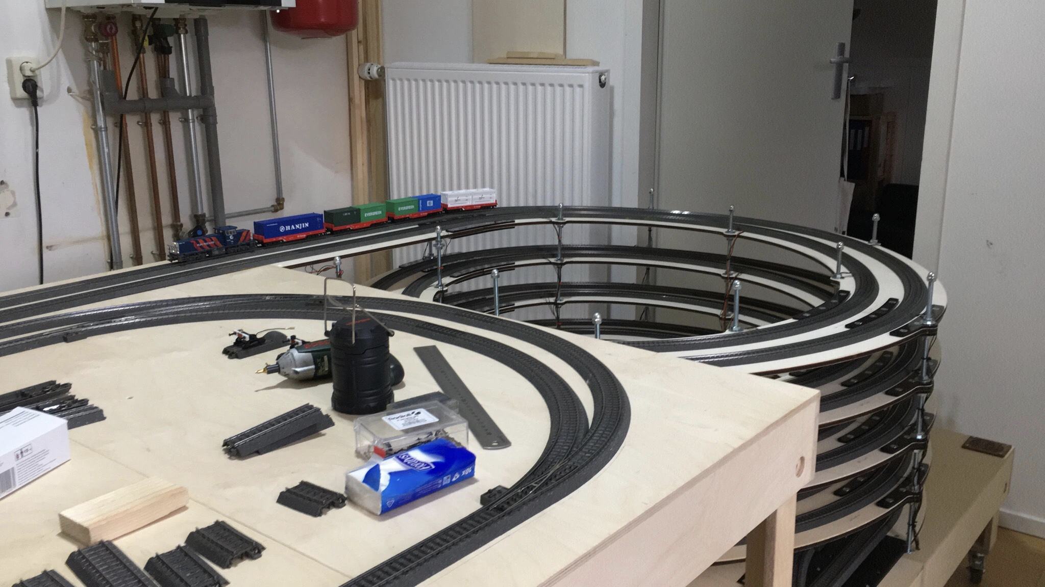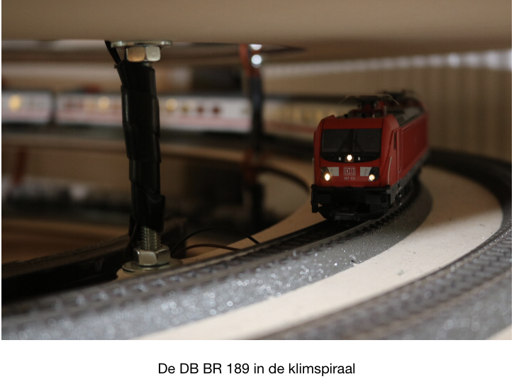 De helix, ook wel klimspiraal genoemd, brengt de treinen van het schaduwstation naar het niveau van de parade- of zichttrack, zo’n 45 cm hoger. Dat gaat in 4,5 omwenteling met dubbel spoor naar boven en beneden. Het binnenste spoor is voor de afdaling en het buitenste spoor voor de stijging. De stijging moet met zo min mogelijk weerstand plaatsvinden. Daarom gebruiken we daarvoor ook de grootste radius. Het moet zo ontworpen zijn dat zowel stijgings- als dalingspercentage rondom de 3% liggen. Anders gaat het teveel ten koste van de motor van de loc. Iedere omwenteling is een blok in iTrain en heeft 2 bezetmelders en 4 voedingspunten. 4 voedingspunten omdat je niet wil dat er treinen stil komen te staan in de helix. Dan moet het wel allemaal kloppen met de bedrading onder de helix en over de hardware van de helix moet goed nagedacht zijn. Het sterkte mij in de overtuiging dat het inschakelen van DAAR en DTS terecht was. Dit krijg je als leek niet of heel lastig voor elkaar.
