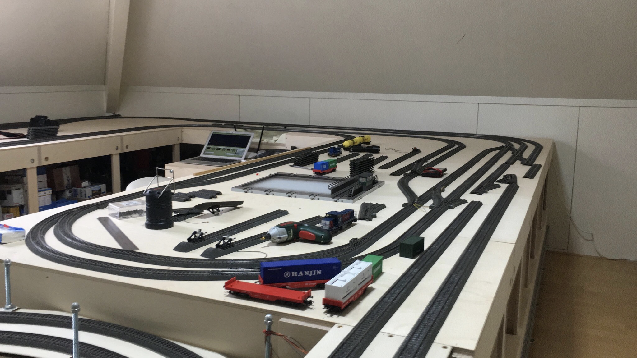 Belangrijk vond ik ook te ontdekken hoever ik wilde gaan. In het begin was dat een uitgebreide ovaal in een kamertje van 3 bij 4, waar ook nog mijn bureau in stond. En nu werken we aan een redelijk complexe baan met schaduwstation en klimspiraal op een zolder 4,5 bij 4,5 meter. Op die zolder stond een joekel van een garderobekast. Die moest natuurlijk weg. Waar naar toe met de inhoud? Naar een nieuw te bouwen inloopkast in de slaapkamer. Dan ook maar gelijk nieuwe vloerbedekking. Zo heeft een modeltrein dus vergaande consequenties. Ik heb daarnaast ook nog een zekere drang tot perfectie en dan is een modeltreinbaan hèt middel om volledig op leeg te lopen, zowel emotioneel als financieel.