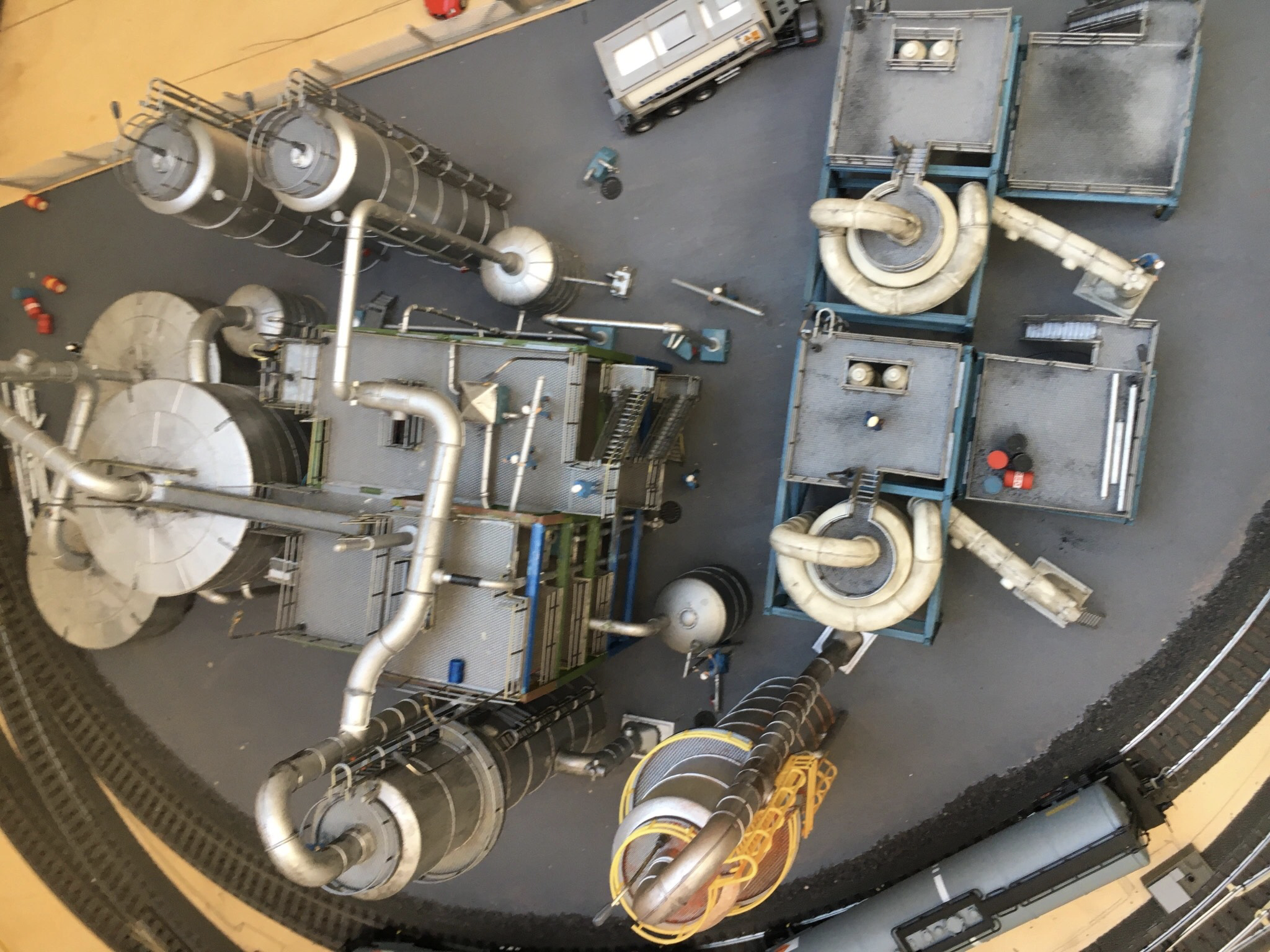 Op deze manier kan je relatief veel verschillende treinen op verschillende momenten naar de zichtbaan toveren, waardoor je een gevarieerd beeld in de zichtbaan krijgt. Daarnaast wilde ik absolute blikvangers op de baan hebben. De klimspiraal is op zichzelf al een blikvanger door het dubbelspoor: een trein daalt af naar het schaduwstation en de andere stijgt naar de zichtbaan. Het is een open constructie dus het is goed te zien hoe de treinen zich naar boven en beneden bewegen. Op de zichtbaan staat een rolbrug die locomotieven naar andere sporen transporteert. De Duitsers noemen het een Schiebebühne wat eigenlijk nog beter zegt wat-ie doet. Ook wordt voorzien in verschillende locomotief onderhoudshallen met automatische openende en sluitende deuren. Op hetzelfde terrein staat een tankfarm compleet met led verlichting zoals in Pernis. Ook is Strukton Railinfra met een grote onderhoudshal voor verschillende railsonderhoud treinstellen nogal vertegenwoordigd. Op de linker tafel komt een grote en functionerende containerterminal evenals een brandweerkazerne en betonfabriek. Daar ook een chemische fabriek, compleet verlicht en met rookuitstoot zoals bij DSM in Limburg. Op de middelste tafel wordt 60 cm A2 geprojecteerd exact volgens de geschaalde afmetingen van een snelweg in Nederland.